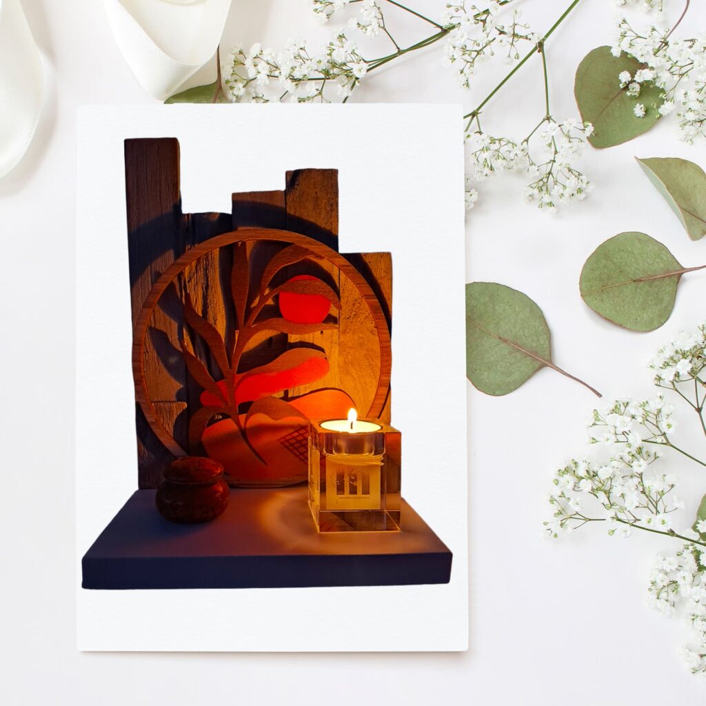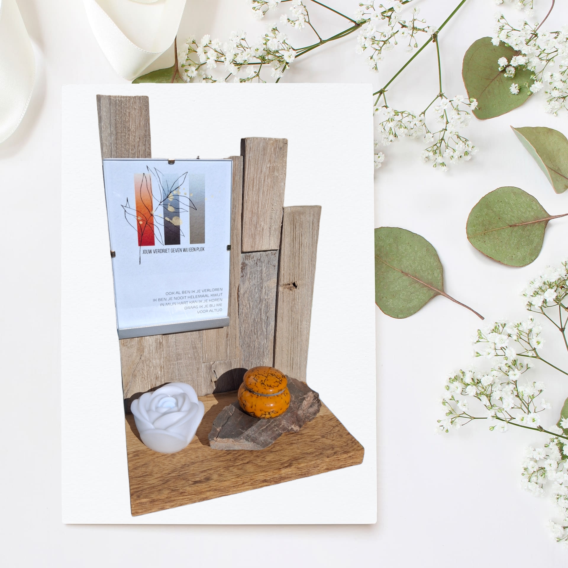 Stel je eigen gedenkplek samen. Keuze uit diverse soorten massief hout, sfeerlichten, urnen en fotolijsten.